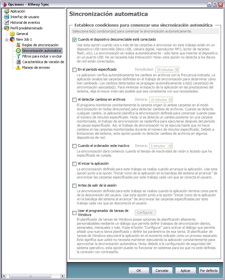 Existen diferentes posibilidades de sincronización, pulsando con el botón derecho sobre una pestaña nos aparece un menú en el que podemos ver las propiedades. Una vez allí se nos abrirá una ventana como se puede ver todo es sumamente intuitivo y además todo viene perfectamente explicado. En mi caso sincronizo con un disco duro externo asi que selecciono «cuando e dispositivo este conectado».